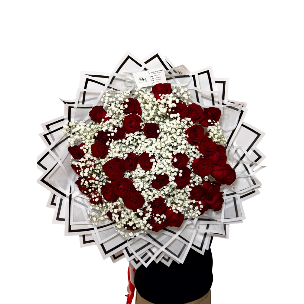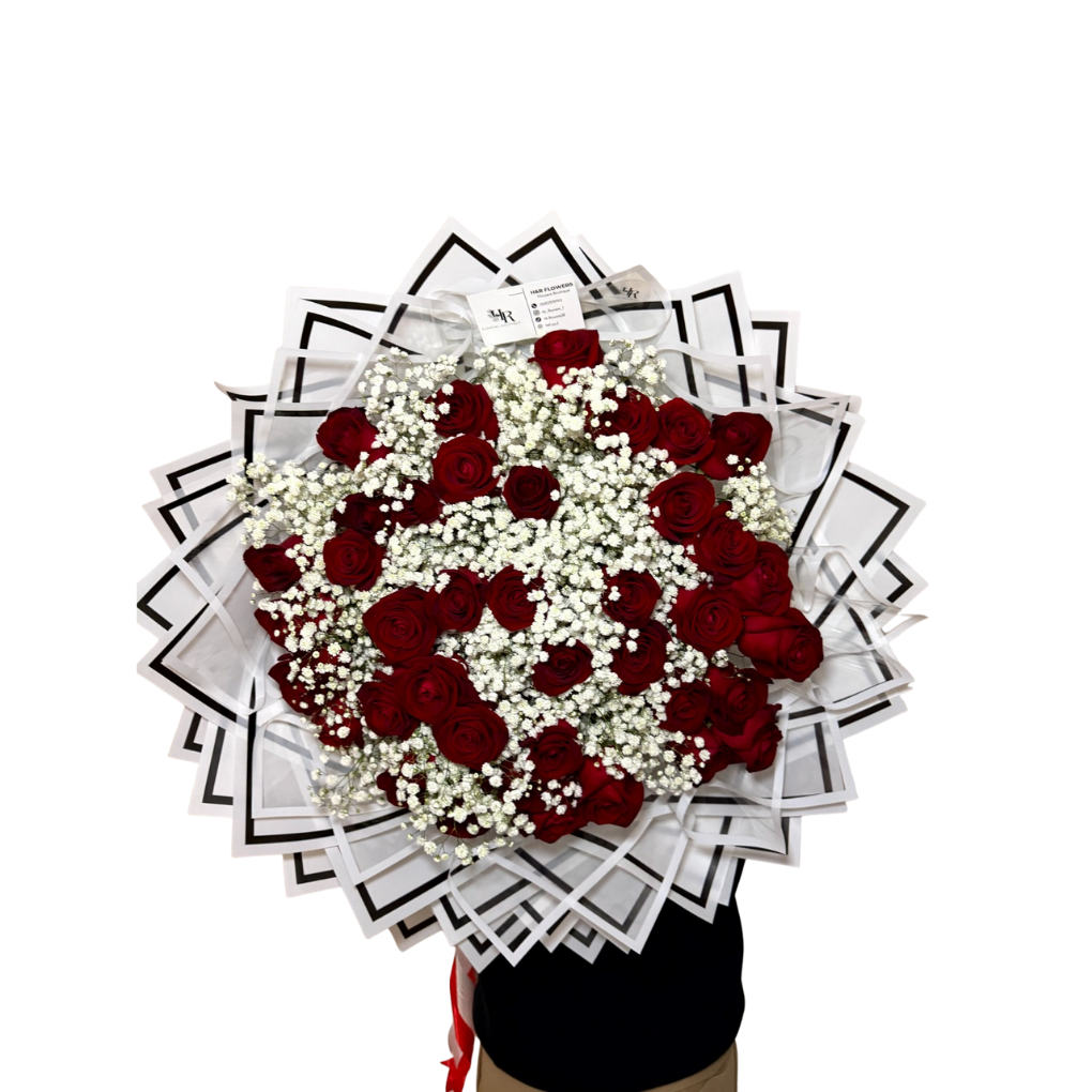 הקלאסיקה פוגשת את המודרני. זר של HR Flowers לוקח את השילוב האהוב ביותר בעולם הפרחים – ורדים אדומים וגיבסנית לבנה – ומעניק לו פרשנות יוקרתית ונועזת. הניגודיות בין צבעי הפריחה העזים לבין האריזה הגיאומטרית המדויקת יוצרת מראה של "תכשיט" פורח, כזה שלא משאיר אף אחד אדיש.