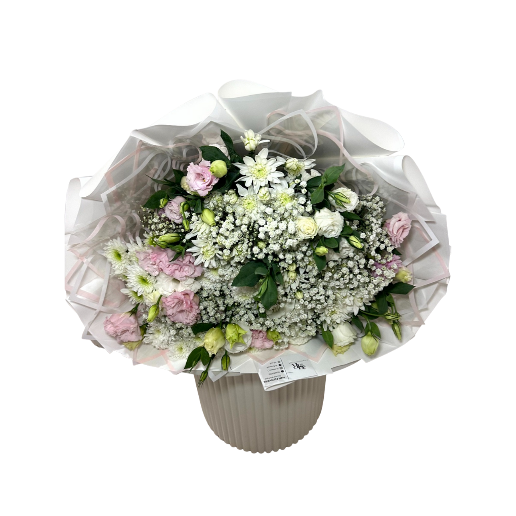 נפח ויוקרה: הזר שזור בשיטה צפופה שמעניקה לו מראה ענק ומלא, עטוף בנייר פרימיום לבן המדגיש את הצבעוניות של הפרחים.